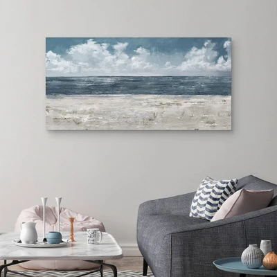 A combination of choppy vigorous and parallel brushstrokes merge to create a coastal trinity of stormy clouds, the deep blue sea, and a blonde sandy beach. Beach Layer Light by Studio Arts is a dimly shaded canvas art print for a mood provoking effect. This coastal wall adornment is the perfect image for a home that can use a little decor pick-me-up.