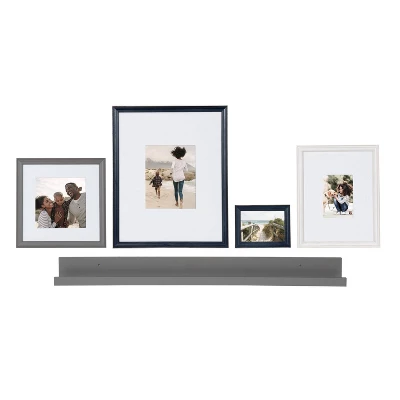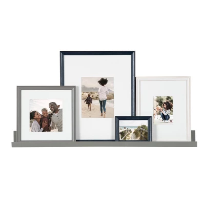 Bring all your memories together with this one-stop frame and shelf kit for your home! Our Bordeaux gallery wall frame and shelf kit include four frames of various sizes and a beautiful shelf to display your favorite pieces of home decor. This set of frames feature navy blue, rustic gray, and white finishes inspired by coastal aesthetics. The large shelf included in this set also features a rustic gray finish to complement the traditional appeal of these frames. The large photo rail display shelf measures 42 inches wide by 1 inch high by 4 inches deep. Photo frame sizes: (1) 16×20 matted to 8×10; (1) 11×14 matted to 5×7, (1) 12×12 matted to 8×8, and (1) 5×7 unmatted.