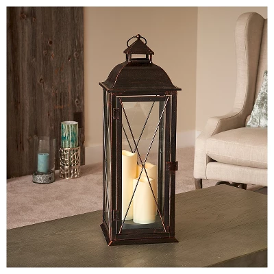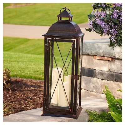 Create soothing ambiance for an outdoor meal with this Salerno Triple LED Candle Outdoor Lantern from Smart Living. Finished in decorative metal with glass panels on all sides, this delightful lantern will add sparkle to any space and let beauty shine through. This versatile lantern comes with an attached ring that makes it easy to hang, and a flat, sturdy bottom that lets it be displayed on a tabletop. This battery-operated lantern provides long-lasting hours of beautiful illumination so you can make your outdoors feel instantly warm and homey.
