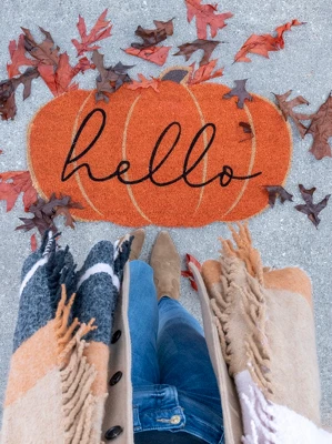 Update your fall décor with Shiraleah’s “Hello” doormat. This charming doormat features a natural background cut out into a pumpkin shape and screen printed text, “Hello”, in a cursive font. The curvature of the cursive font adds a charming yet sophisticated look to the “Hello” pumpkin doormat. Measuring 30” x 18”, and made from coir with vinyl backing, this doormat is the perfect way to add a little fall charm to your exterior.