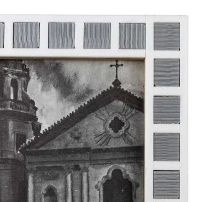 Let your favorite memories be accented by the unique border of this 5×7 photo frame. A traditional style frame by Foreside Home & Garden. The pieced resin border with gray and white tiles provide a modern accent for your photo. The gray tiles have a ridged texture that pairs well with the sleek white edging around each tile.